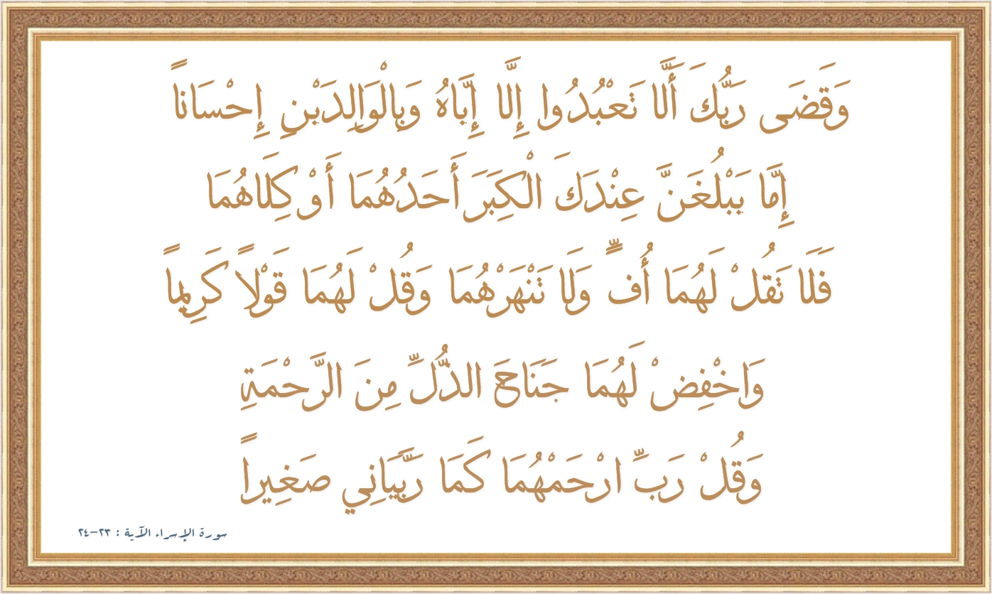﴿ وَقَضَى رَبُّكَ أَلَّا تَعْبُدُوا إِلَّا إِيَّاهُ وَبِالْوَالِدَيْنِ إِحْسَاناً إِمَّا يَبْلُغَنَّ عِنْدَكَ الْكِبَرَ أَحَدُهُمَا أَوْ كِلَاهُمَا فَلَا تَقُلْ لَهُمَا أُفٍّ وَلَا تَنْهَرْهُمَا وَقُلْ لَهُمَا قَوْلاً كَرِيماً * وَاخْفِضْ لَهُمَا جَنَاحَ الذُّلِّ مِنَ الرَّحْمَةِ وَقُلْ رَبِّ ارْحَمْهُمَا كَمَا رَبَّيَانِي صَغِيراً ﴾